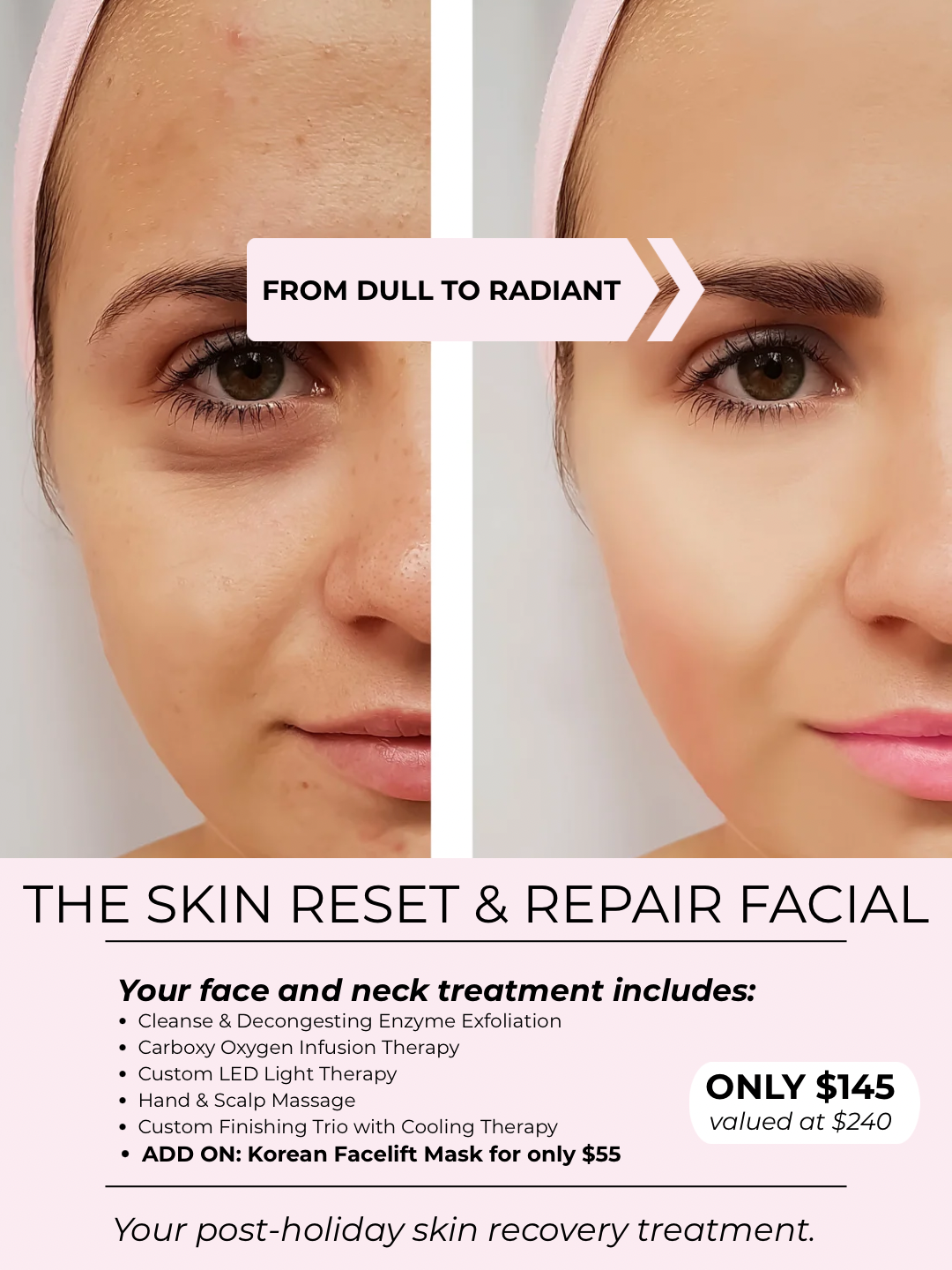 For enhanced results, the Korean Facelift Mask can be added to lift, firm, and boost hydration for a visibly refreshed finish for only $55.